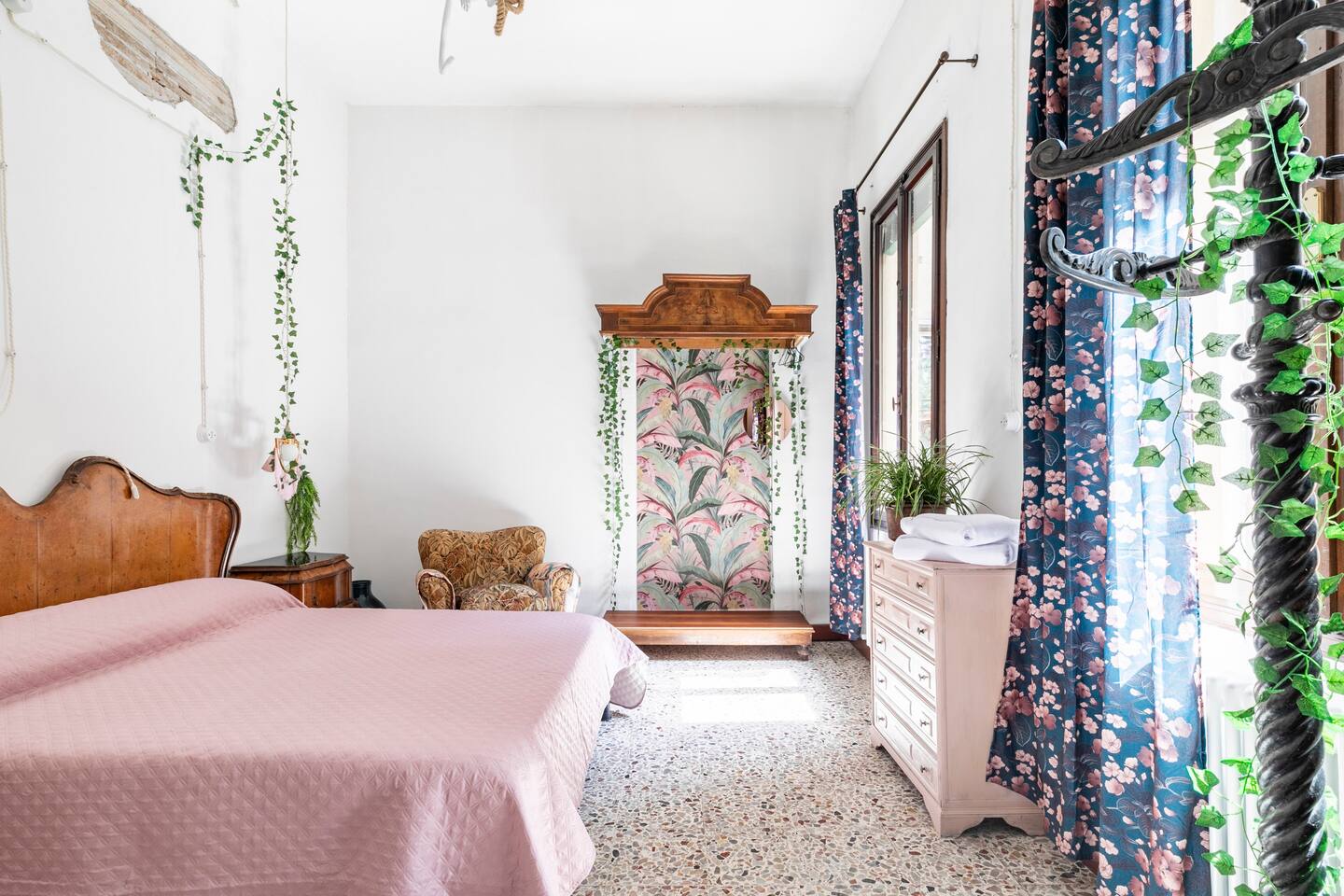 Natura che viene ripresa dai temi della carta da parati, dalle lampade e dalle piante presenti in ogni stanza ma anche nella scelta di materiali ecosostenibili come la cucina, le cui ante sono prodotte in materiale riciclato.